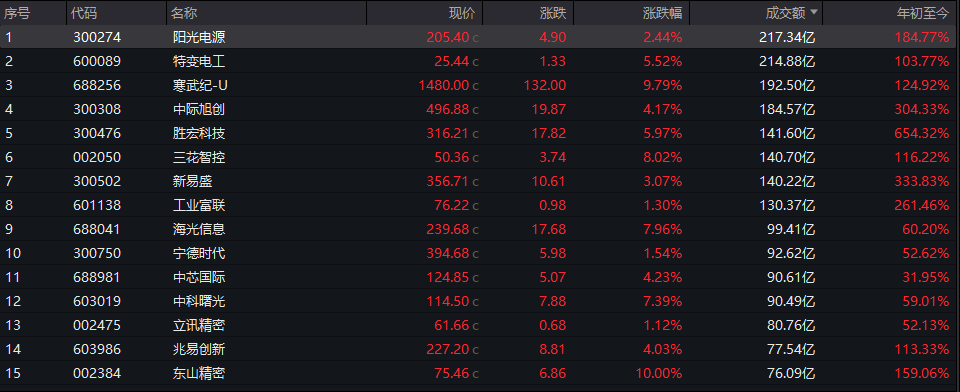 阳光电源成交额居首,为217亿元。后来是特变电工、寒武纪-U、中际旭创、胜宏科技,成交额诀别为214亿元、192亿元、184亿元、141亿元。